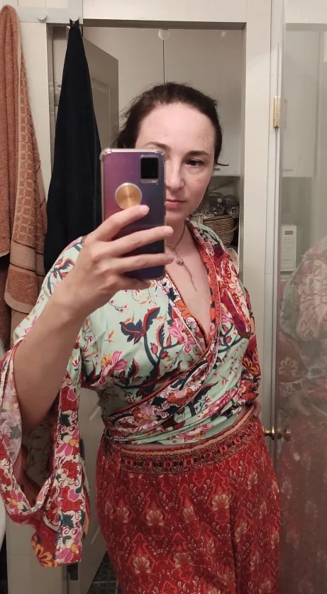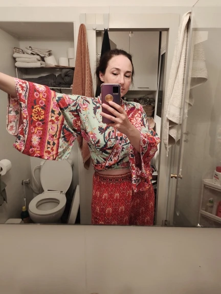 Ce kimono court bohème aux nuances vert grisé mêle douceur et audace dans une harmonie florale éclatante. Ses fleurs rouge, orange et bleues s’épanouissent sur un fond apaisant, rappelant la vitalité des jardins japonais. Léger et fluide, il sublime chaque mouvement, offrant une élégance naturelle à la fois romantique et affirmée.