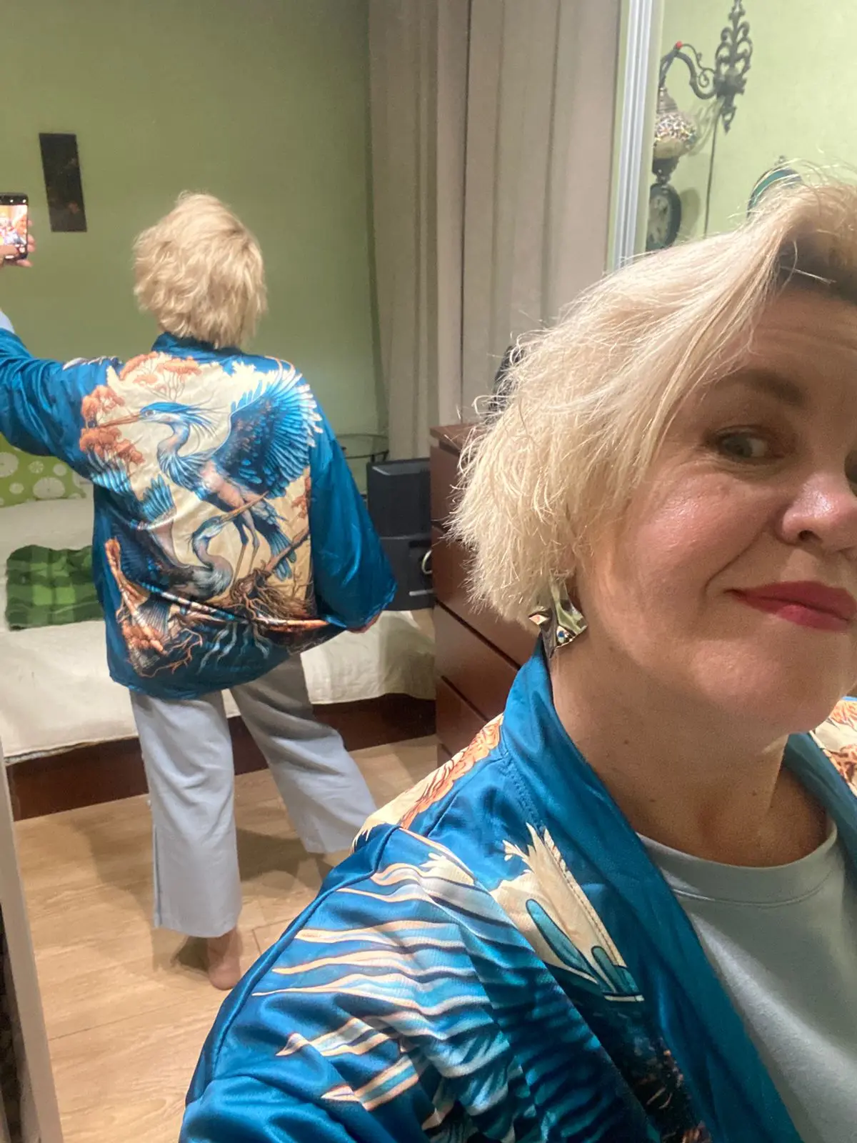 Ce kimono japonais oversize illustre la grâce des hérons, symboles de longévité et d’élégance dans la culture nipponne. Sur un fond orné de motifs floraux dorés, les nuances de vert pétrole, bleu canard et bleu nuit s’unissent pour créer une harmonie visuelle captivante. Une pièce unique, contemporaine et intemporelle.