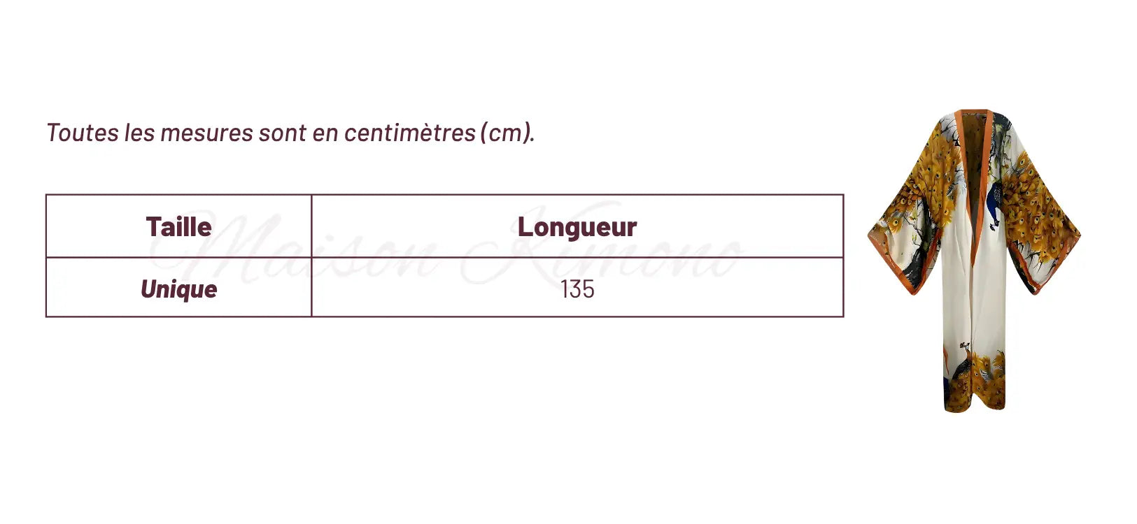 Ce kimono long en soie satinée orange aux reflets dorés célèbre la majesté du paon, symbole de beauté et de noblesse dans l’art japonais. Son tissu fluide et respirant reproduit fidèlement l’éclat de la soie naturelle tout en restant facile d’entretien. Une pièce raffinée qui allie confort, prestance et élégance intemporelle.