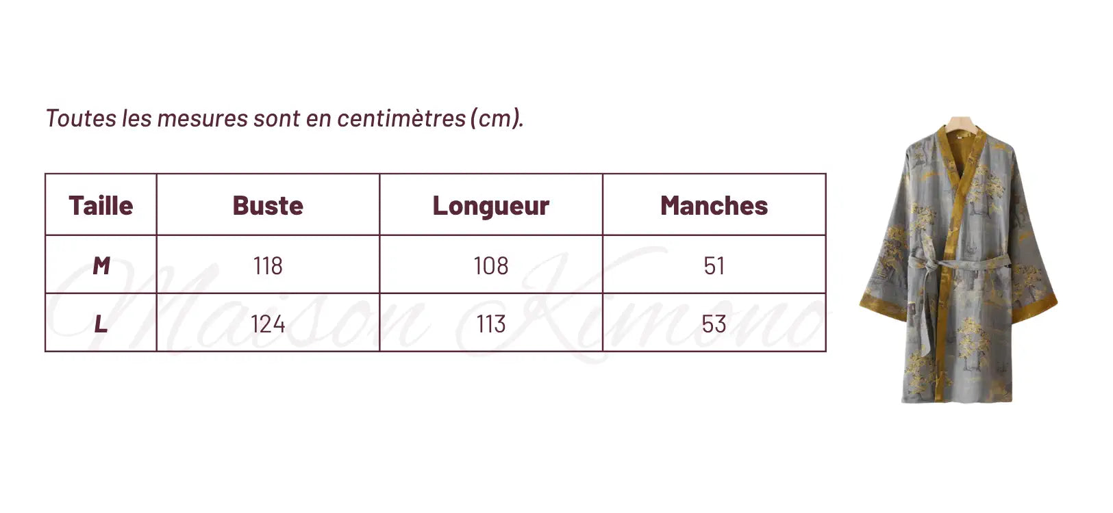 Ce peignoir kimono gris pour homme met en lumière l’art du sansui-ga avec un paysage automnal raffiné aux teintes ocre et brunes. Rehaussé de bordures dorées moutarde, il capture la poésie de l’automne nippon. Sa coupe traditionnelle fluide et son coton noble en font une pièce à la fois confortable et sophistiquée.