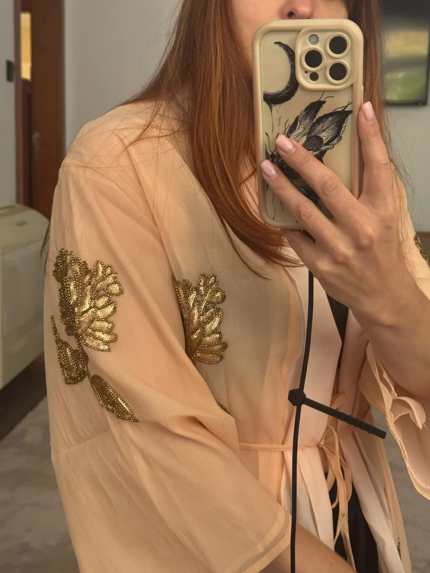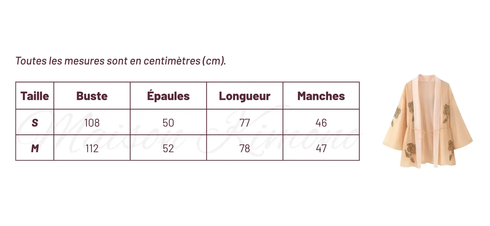 Cette veste kimono beige pêche incarne la rencontre subtile entre élégance japonaise et raffinement moderne. Les broderies florales dorées et marron évoquent la délicatesse artisanale, tandis que sa coupe ample et ses manches kimono créent une silhouette gracieuse et fluide. Ce vêtement unique sublime instantanément toute tenue avec distinction.
